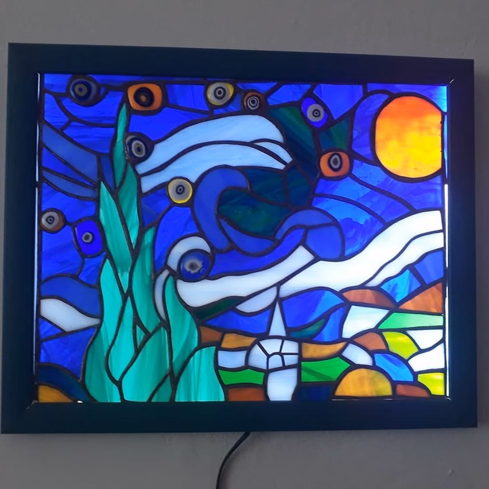 Nagyon szép megbízást kaptunk: keretezni és megvilágítani egy elkészült tiffany képet. Izgalmas ilyenkor, hogy milyen keretet válasszunk, ami nem nyomja el a képet, hiszen a képen van a hangsúly és nem a kereten. Nagyon sokat próbálgattuk, de mégis a türkiz mellett döntöttünk. Mind a két helyzetben megállja a helyét.