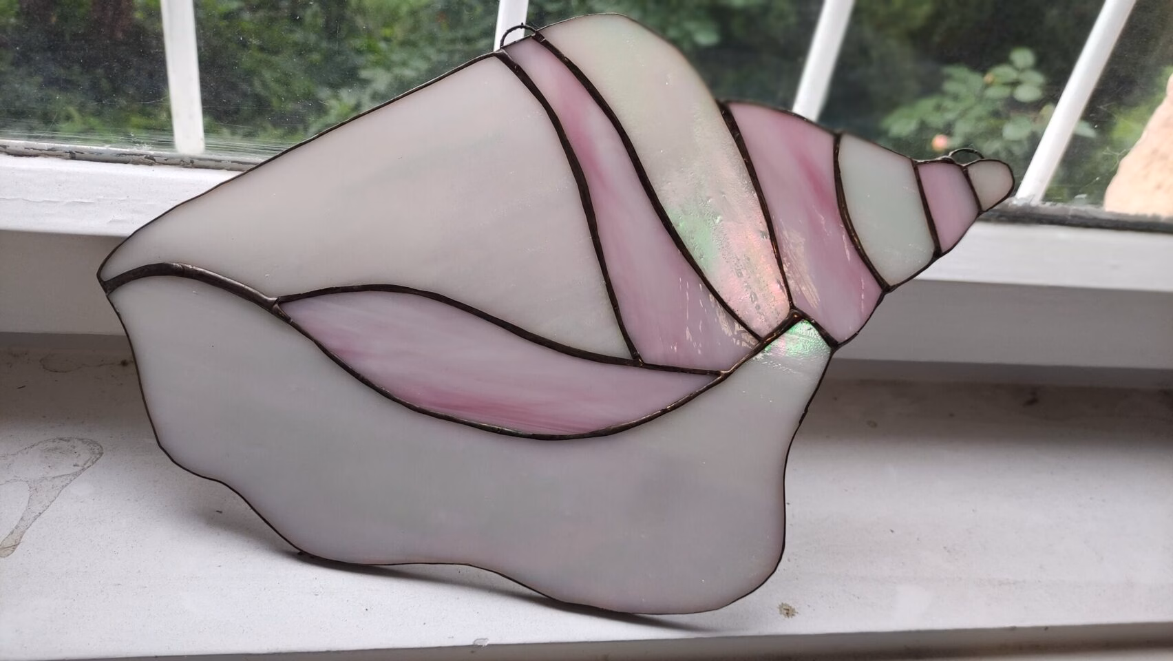 Tiffany technikával készült csiga, rózsaszín és fehér irizáló üvegekből.
