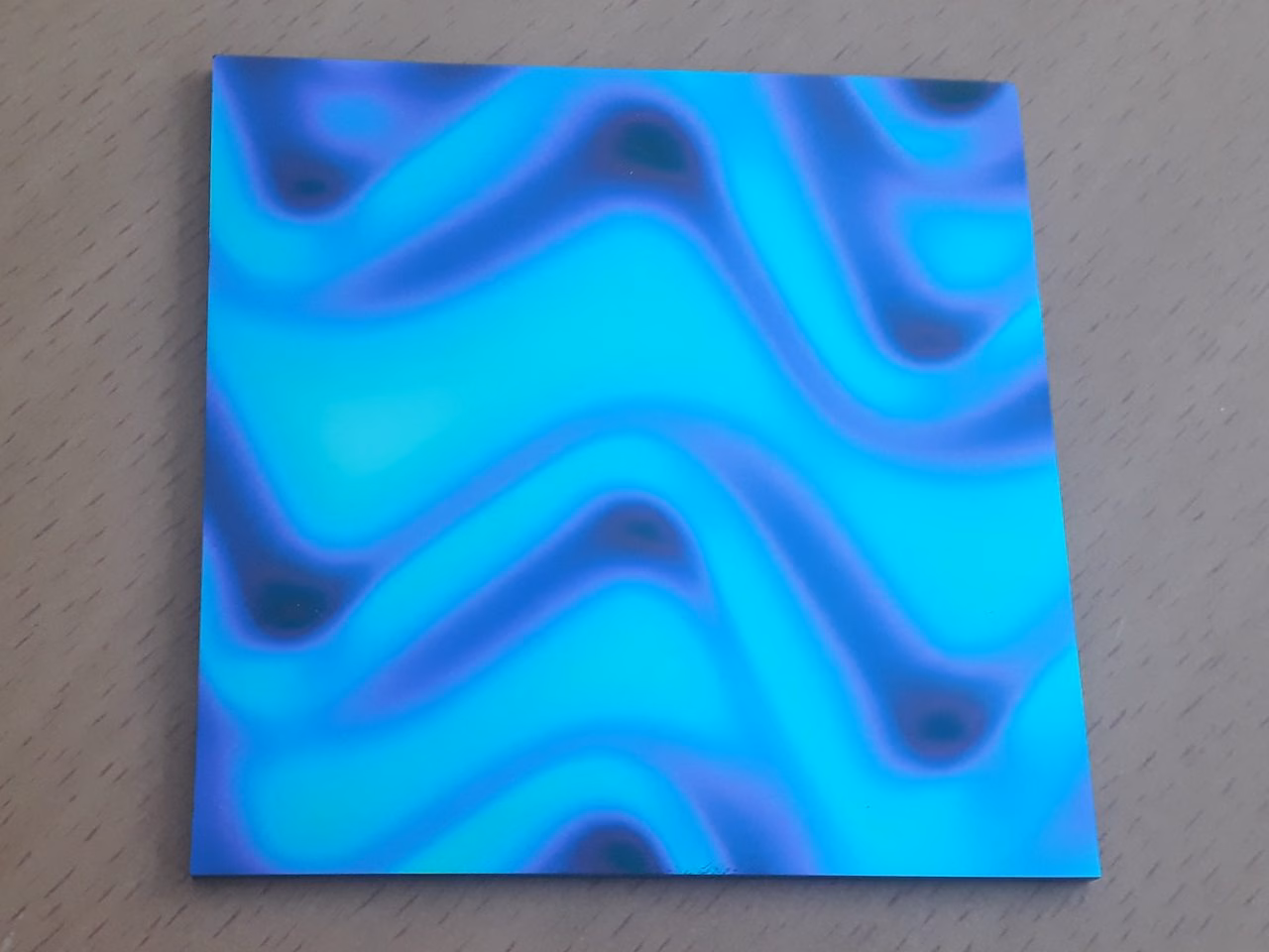 Olvasztás után kék színű lesz és a fekete hullámok is megmaradnak. COE 96-es üvegekkel kompatibilis. A gyártó tájékoztatása szerint az üvegek nem mindig azonos árnyalatra égnek ki és akár táblán belül is lehetnek eltérések. Az ár 4,2*8,5 cm- es darabra vonatkozik.