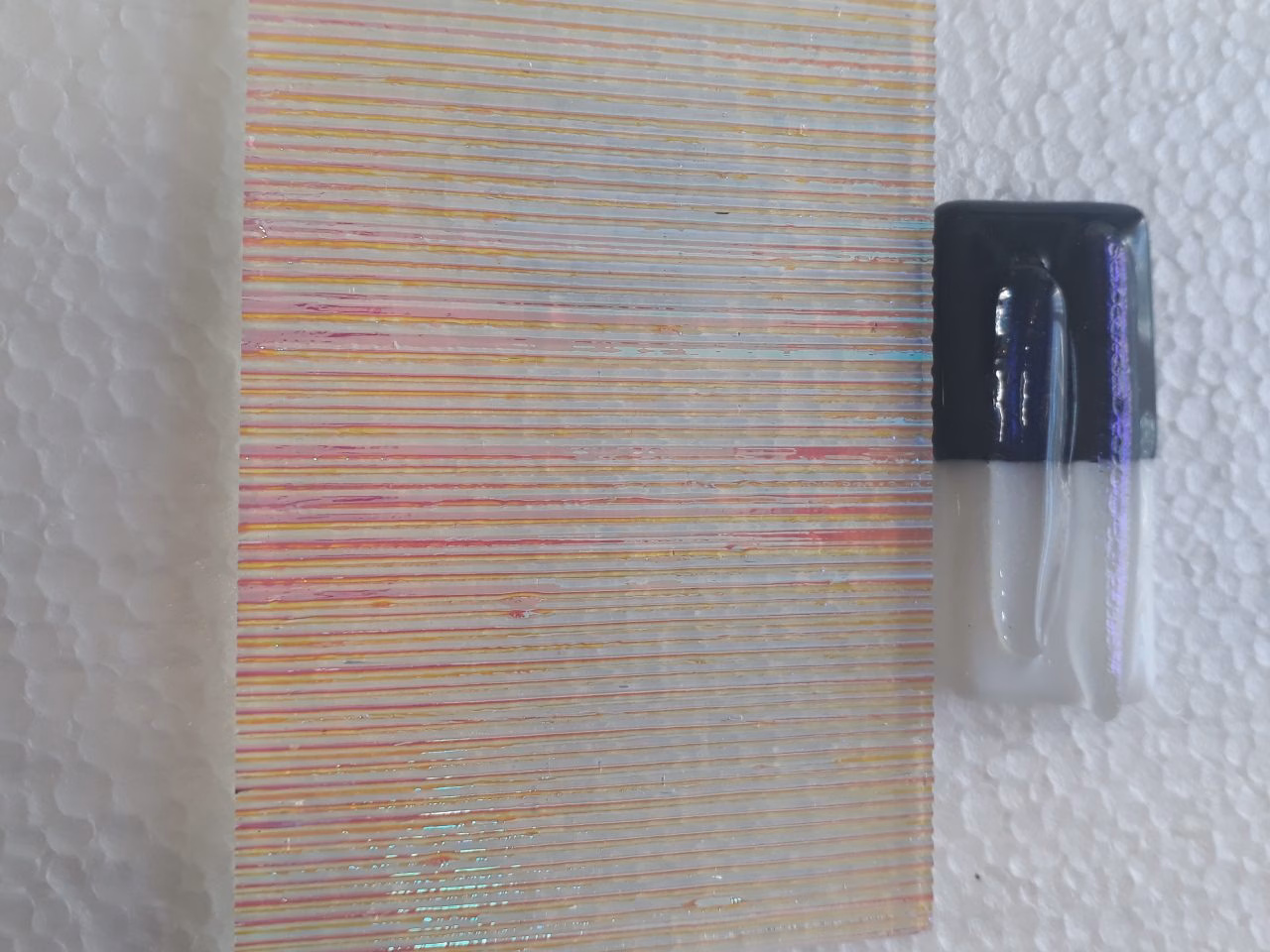 Olvasztás után lila színű lesz és megmarad a bordázata. COE 96-es üvegekkel kompatibilis. A gyártó tájékoztatása szerint az üvegek nem mindig azonos árnyalatra égnek ki és akár táblán belül is lehetnek eltérések. Az ár 4,2*8,5 cm- es darabra vonatkozik.