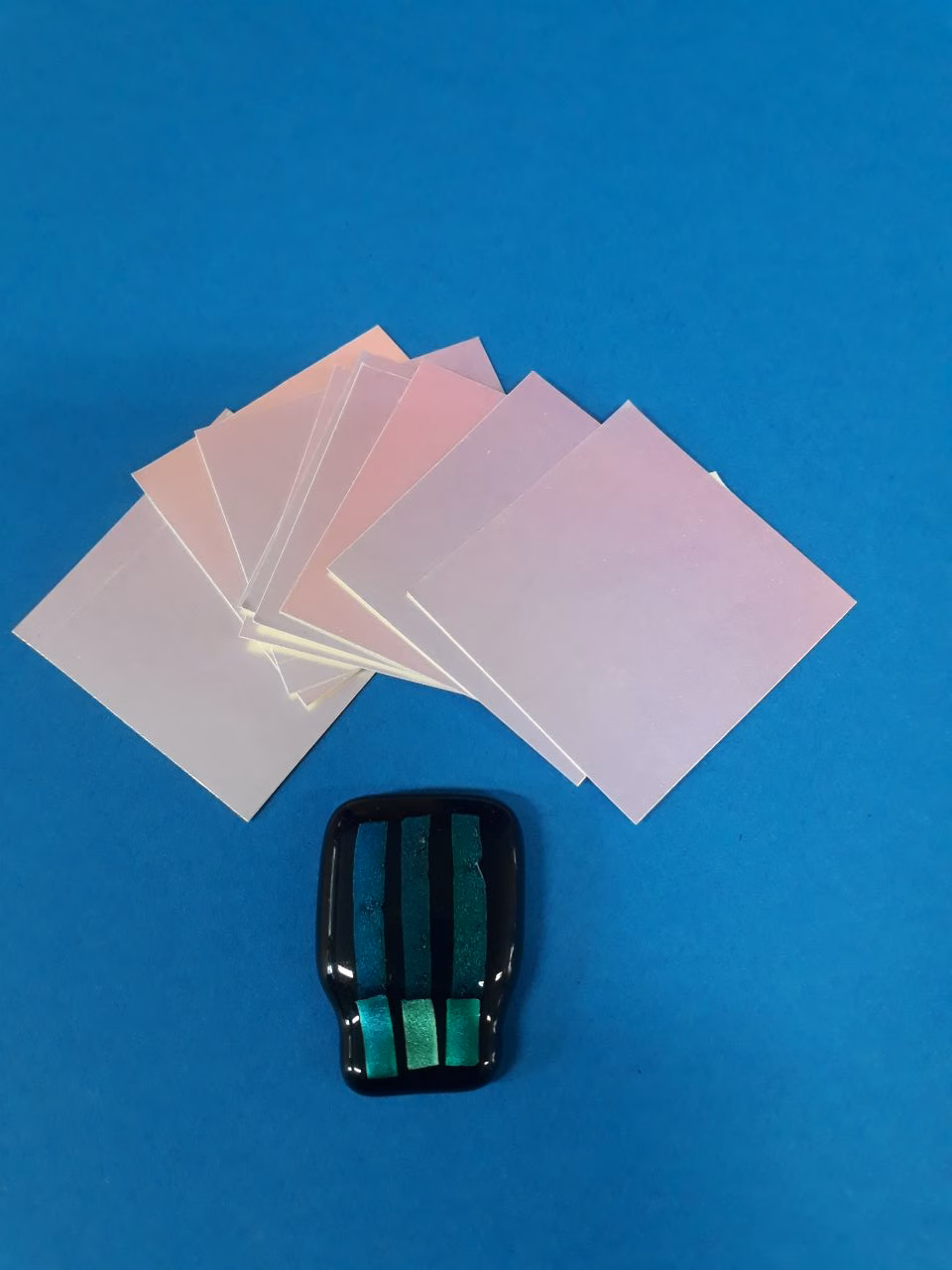 Minden üvegre kompatibilis. 1. Vágd fel a papírt a kellő méretre illetve mintára. 2. Áztasd be 1-2 percig desztillált vízbe. 3. Vedd ki a vízből a leázott dichroic fóliát. 4. Óvatosan helyezd rá az üvegre és töröld le az esetleges vízcseppeket. 5. Olvaszd a szokásos módon és fedőüveg használatát javasoljuk. Amennyiben nem ázik le a papír áztasd picit több ideig.