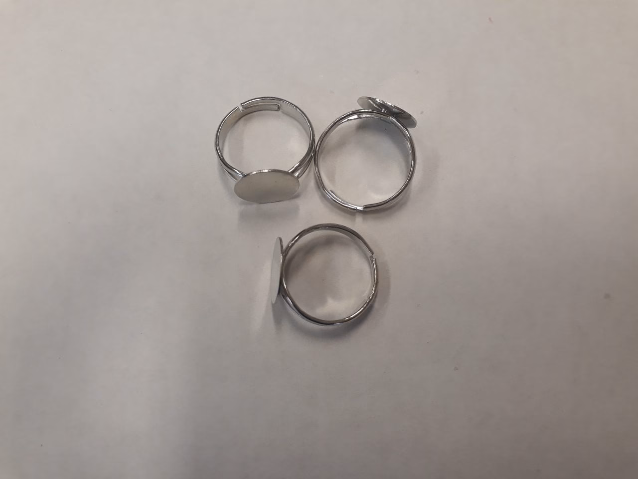 Rhodium bevonatos gyűrűalap. Tányérja 12 mm átmérőjű és a gyűrű része állítható.