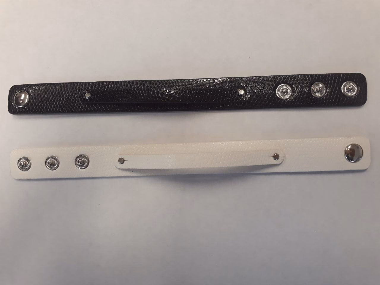 Műbőr alap, melynek felső részén egy patentos rátét helyezkedik el.