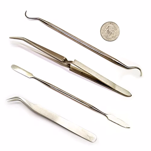 Van benne egy kétoldalú spatula, egy kaparó és két csipesz.