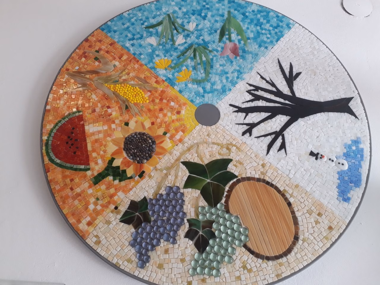 80 cm átmérőjű fa alapra készített üvegmozaik kép.