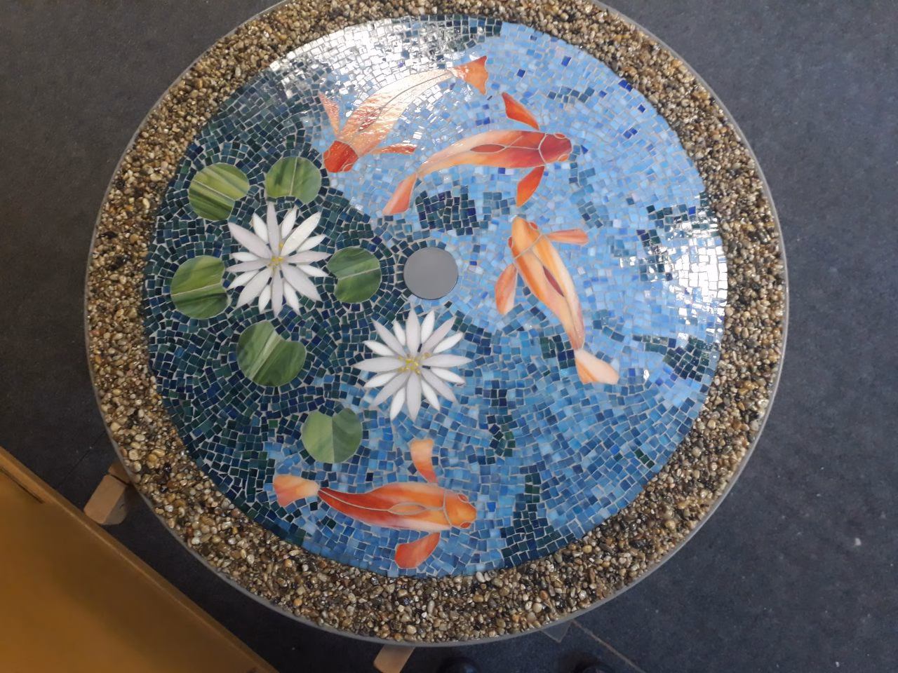 Mozaikozott asztallap 80 cm átm. halas tó