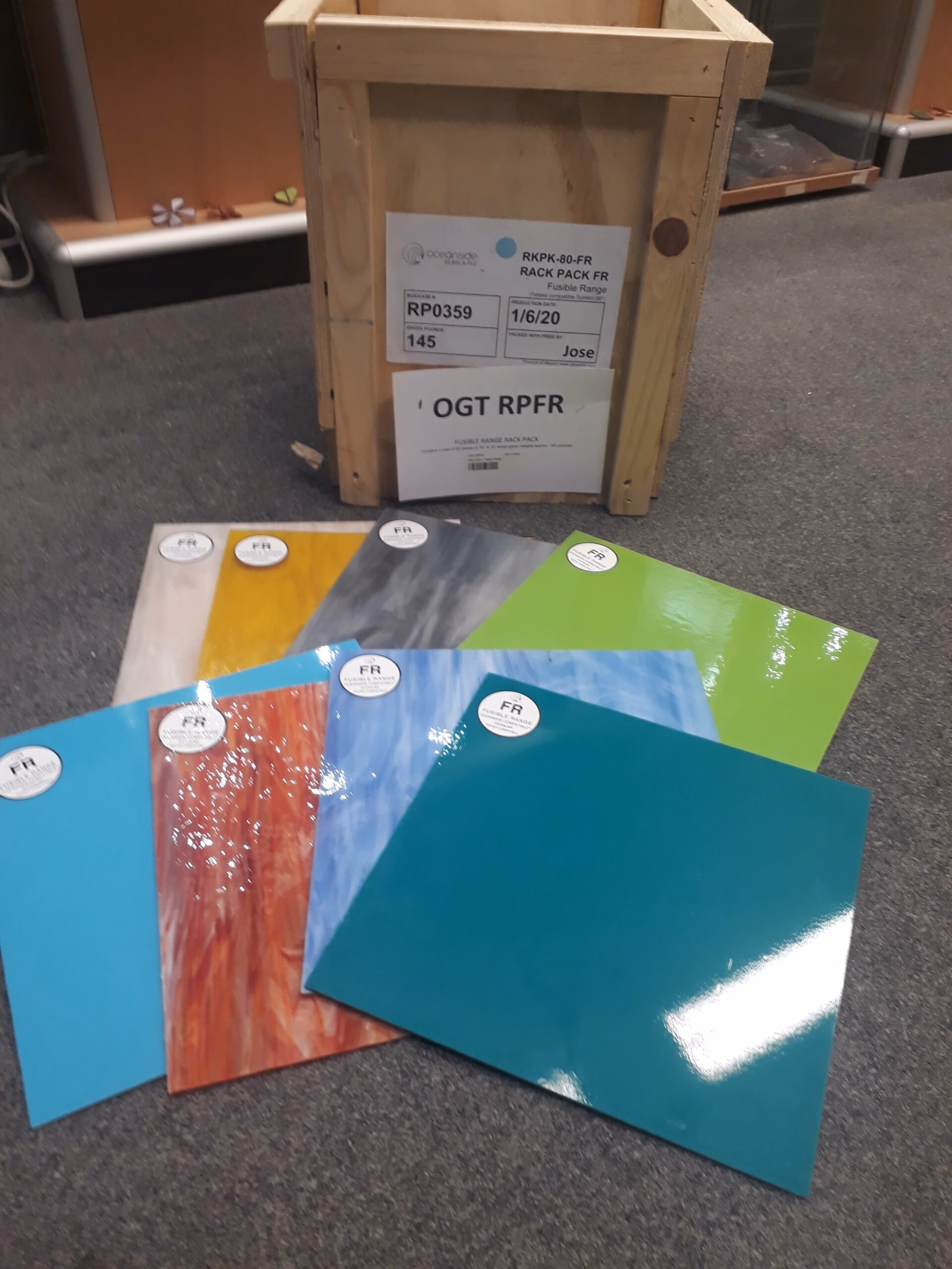 Vegyes színű max. 30*30-as méretű OGT gyár által gyártott üveglapok. A gyártó kifejezetten olvasztásra ajánlja, de természetesen használható ólomüvegezésre és díszüvegezésre is.