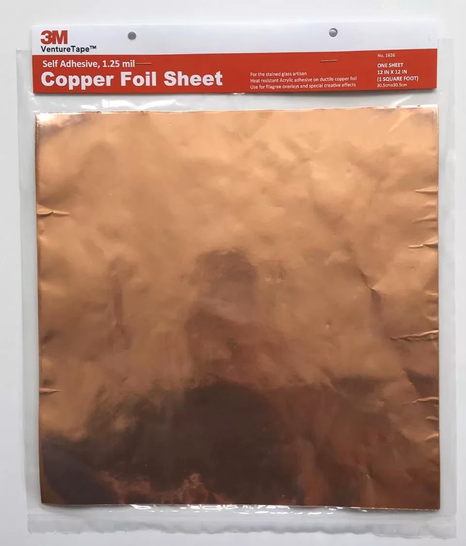Hőálló, egyoldalon tapadó rézfólia, melynek, öntapadós így az üveggel találkozó oldala réz színű.