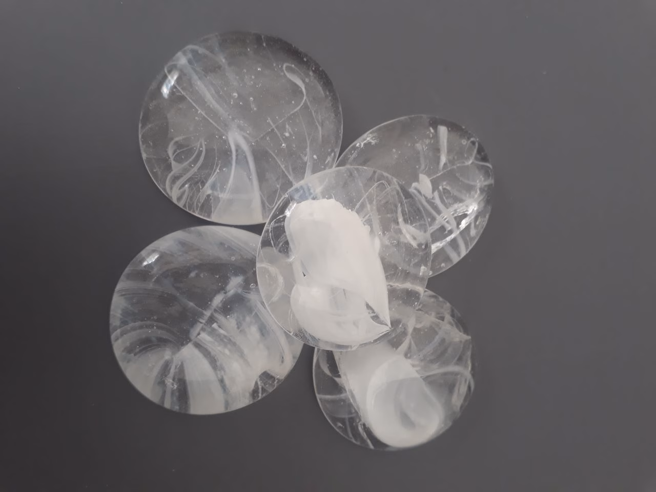 Szabálytalan kör alakú üvegkövek,melyekben a átlátszó és a fehér keveredik.