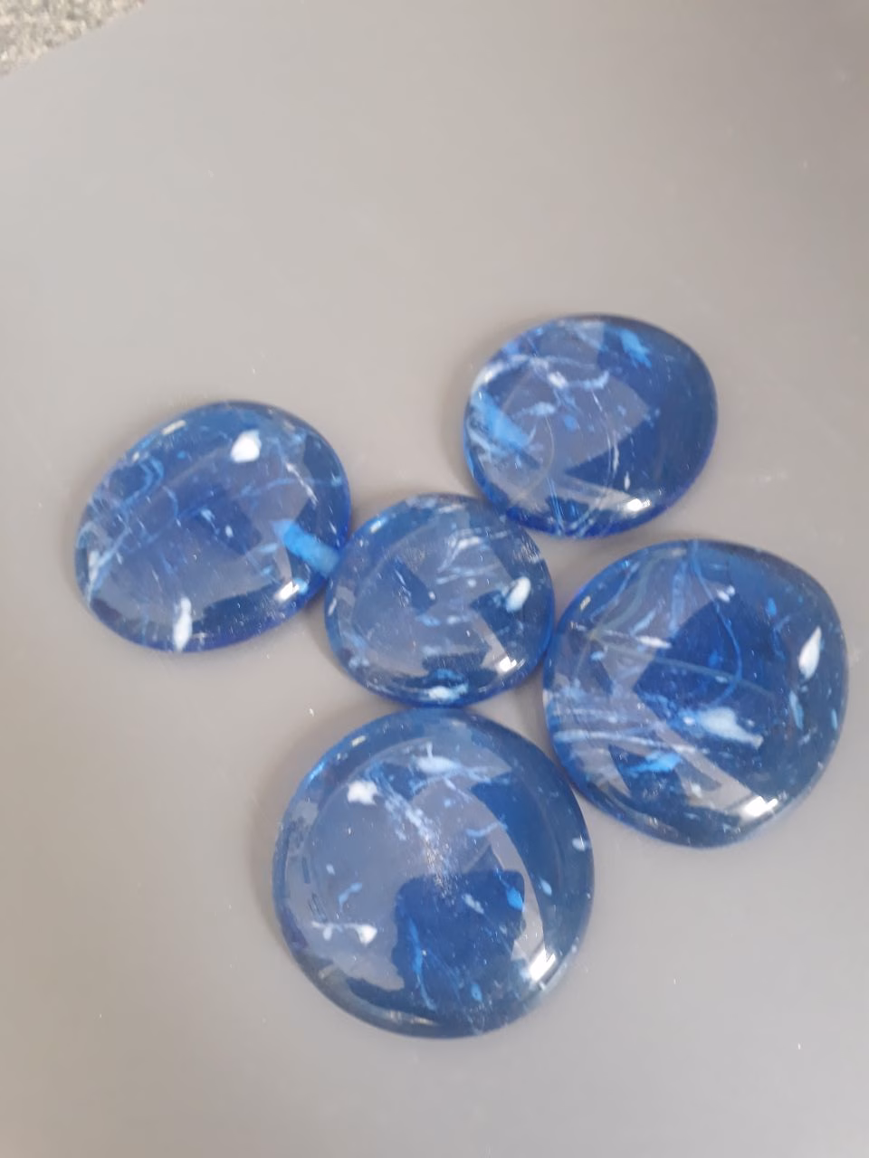 Szabálytalan kör alakú üvegkövek,melyekben a fehér és a sötétkék szín keveredik.