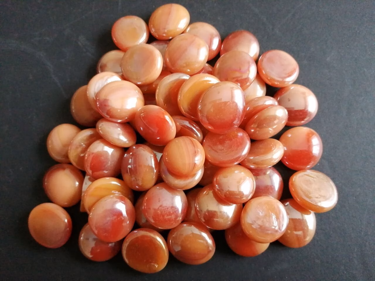 Gyöngyház narancsszínű üvegkavics, mérete 18 és 20 mm között váltakozik.